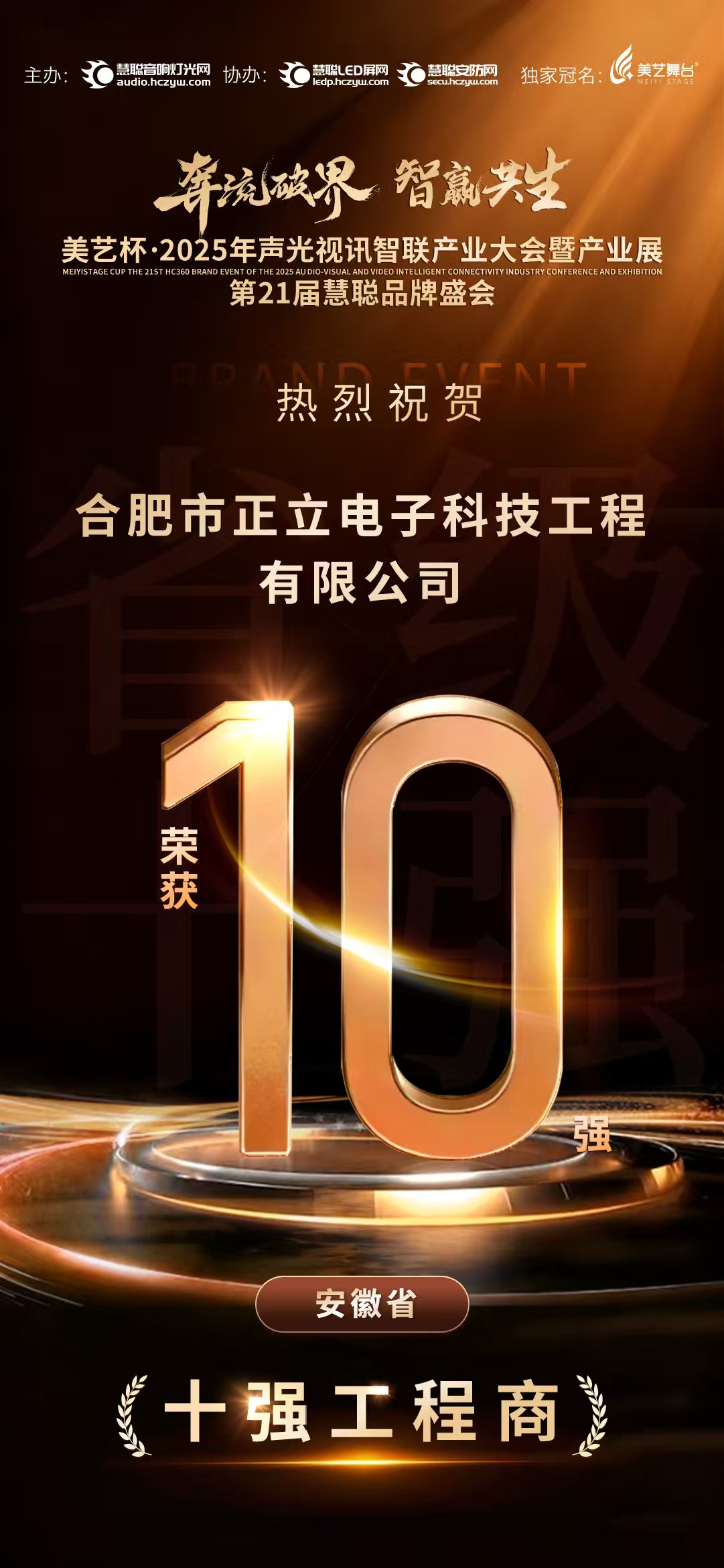 近日,美艺杯·2025年声光视讯智联产业大会暨第21届慧聪品牌盛会在广州圆满落幕。凭借在音视频系统集成领域的卓越实力与行业影响力,合肥市正立电子科技工程有限公司(以下简称“正立电子”)斩获全国百强工程商与安徽省十强工程商两项重磅荣誉,彰显了企业在行业内的领先地位与专业价值。